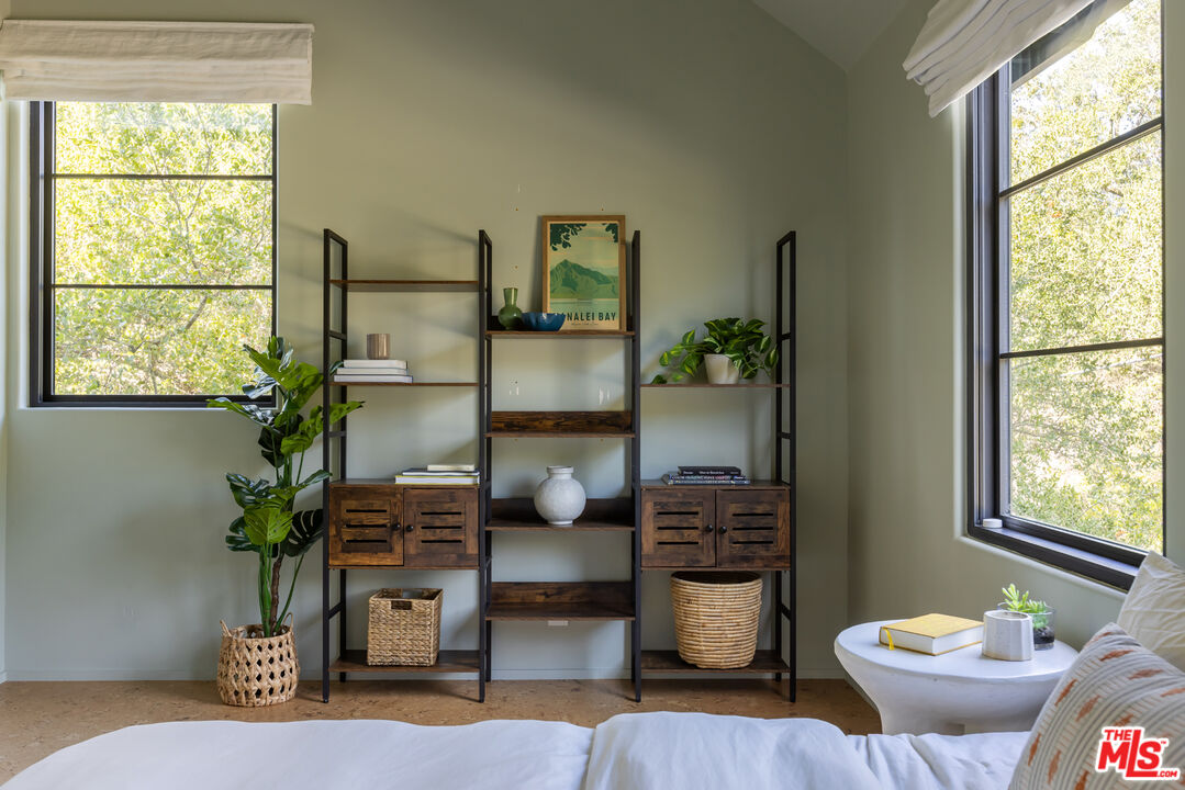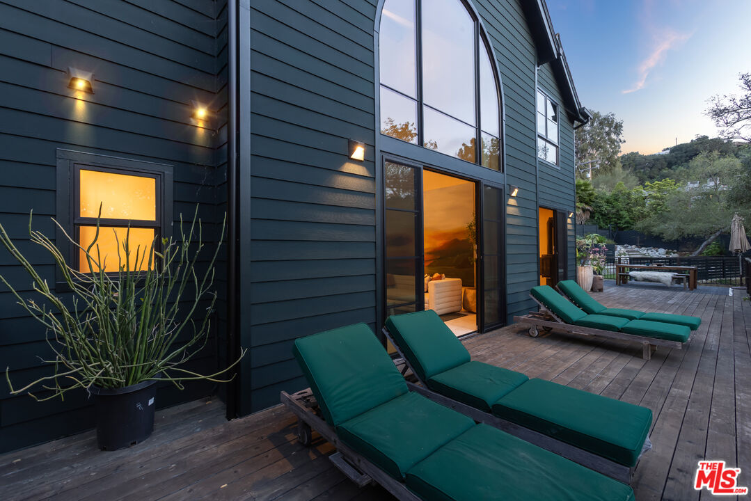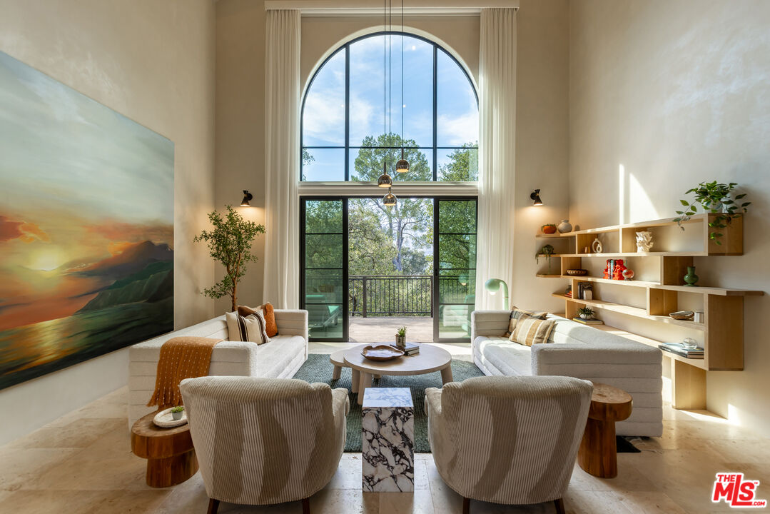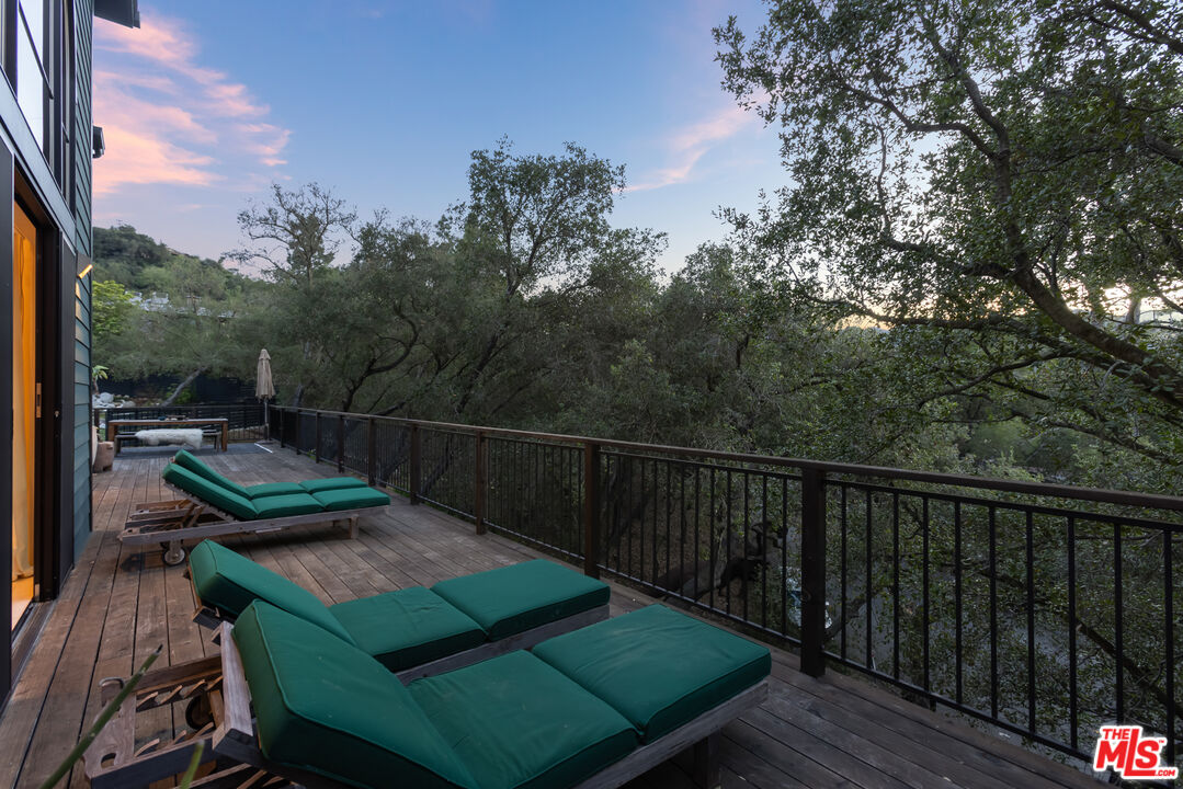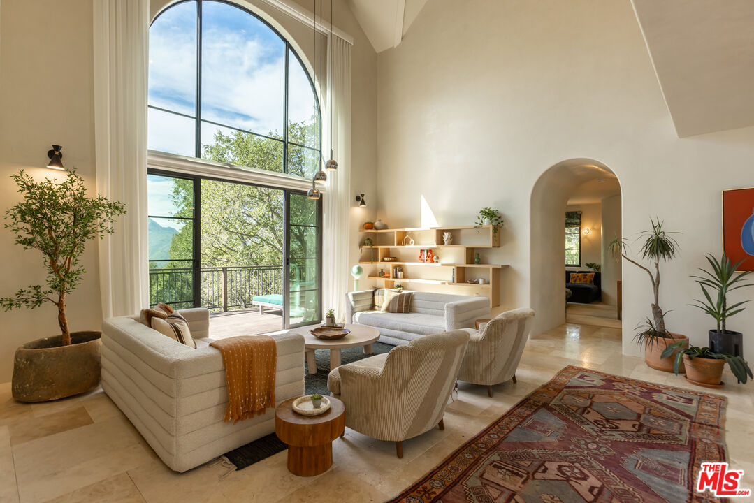 Set along a quiet, private drive in Topanga's coveted PO Tract, this exceptional architectural home captures the essence of elevated canyon living- where design, nature, and creativity seamlessly blend together. Originally part of a historic ranch and surrounded by protected State Park land, the setting offers rare privacy, natural beauty, and accessibility to miles of scenic trails, all just minutes from town and a short drive to the coast. Completely reimagined in 2022 by a renowned Los Angeles designer, the home is a study in thoughtful craftsmanship and refined artistry. Every detail has been carefully considered, from sustainably sourced wood elements to bespoke finishes that lend warmth, soul and authenticity throughout. Bathed in natural light, the interiors are defined by soaring cathedral ceilings, dramatic double-height living spaces, and expansive picture windows that frame mountain and treetop views. Stepping inside, you'll immediately be captivated by the main living area, an inviting space that feels both grand and intimate. The open-concept layout flows effortlessly from the living room into a beautifully appointed kitchen featuring premium appliances, designed for both everyday casual living and inspired entertaining. Custom cabinetry offers plenty of room for all your cooking essentials and storage galore. Dining and gathering spaces extend naturally outdoors, with all doors opening to expansive decks and lounge areas ideal for al fresco meals, sunset moments, or quiet mornings immersed in nature. Upstairs, the primary suite is dreamy and calming, feeling like your own private refuge with a breathtaking ensuite bath and windows overlooking the greenery and pool below. The second en-suite bedroom features a custom loft space (and a climbing wall!). A third spacious bedroom is a perfect place to imagine- it could stay a bedroom, perhaps be used as an exceptional home office or fulfill any other creative need. A unique architectural bridge connection and vaulted ceilings enhance the sense of openness and design continuity throughout the upper level. Set on approximately half an acre, the grounds are both lush and purposeful. Mature oak trees, native landscaping, and terraced gardens create a serene outdoor environment, while an array of fruit trees and raised garden beds invite a farm-to-table lifestyle. The property also features a refreshing pool/spa, outdoor lounge space, and multiple gathering spaces designed for both large-scale entertaining and quiet reflection. Additional amenities include a two-car garage with direct access, a spacious basement ideal for creative projects or storage, ample guest parking and a separate garden shed. The lower portion of the lot offers potential for an ADU, providing flexibility for future expansion or income opportunities. The home has also served as a sought-after location for lifestyle and design photography with past owners, offering additional revenue potential. This special home embodies the spirit of Topanga. Welcome home!